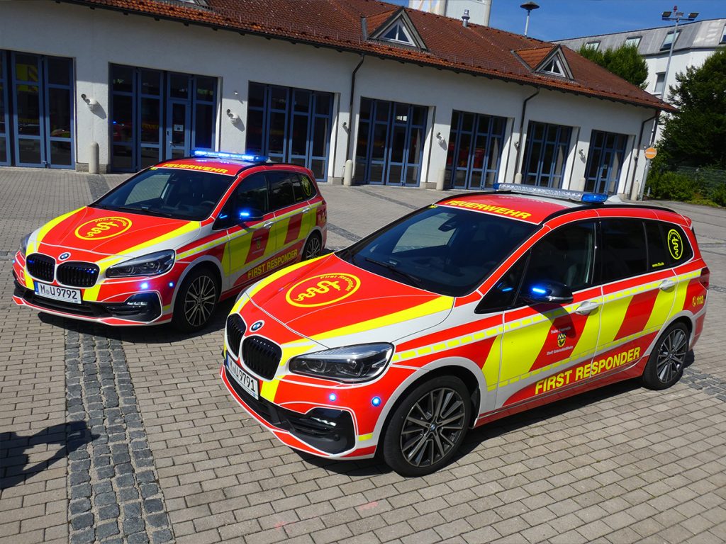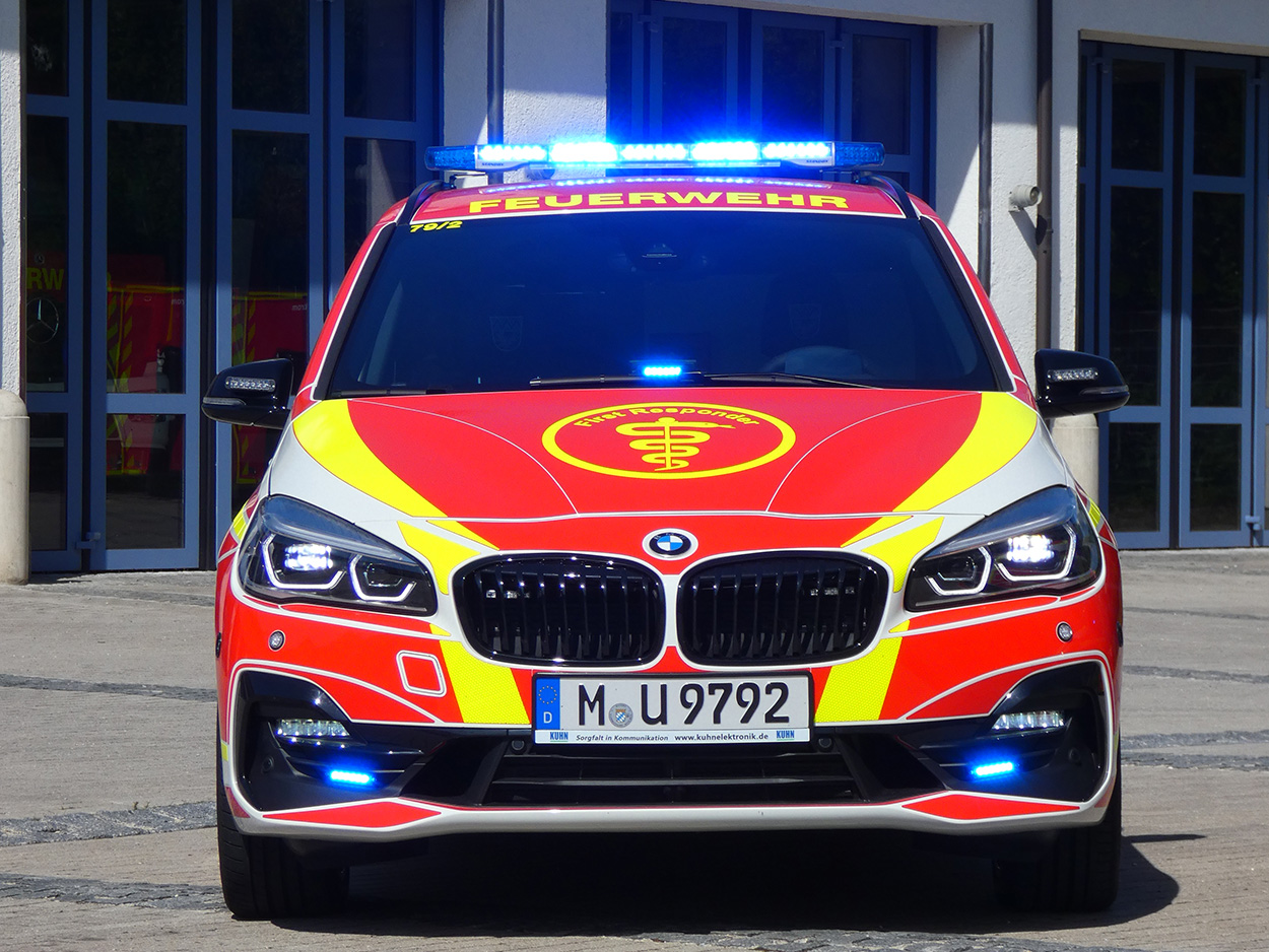 Als Basis dienen zwei BMW 2er Gran Tourer, welche nach sorgfältiger Prüfung am Besten zu den Anforderungen der ehrenamtlichen Helfer passen. Bei der Auswahl der Sondersignalanlage war das wichtigste Kriterium die Sicherheit der Nutzer, so verwundert es auch nicht, dass eine Vielzahl an optischen und akustischen Elementen zum Einsatz gekommen sind.
