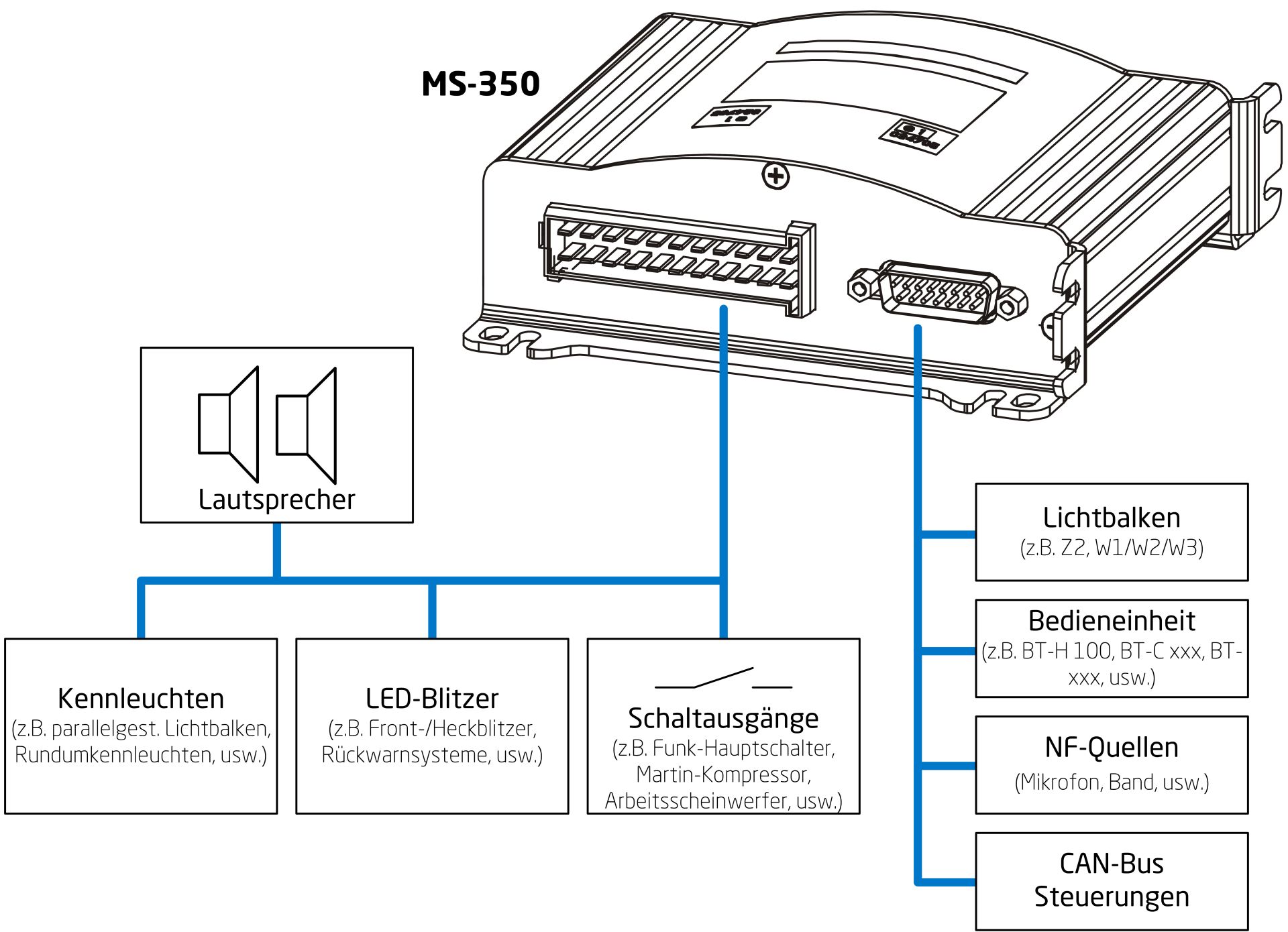 Tauchen Sie ein in die Zukunft der Sondersignalanlagen mit unserem fortschrittlichen Steuergerät MS-350. Es vereint die Leistung einer Sondersignalanlage mit der Vielseitigkeit eines Steuergeräts und ermöglicht es Ihnen, die Kontrolle über Ihre Einsatzfahrzeuge wie nie zuvor zu übernehmen. Durch individuelle Konfiguration nach Ihren Wünschen bestimmen Sie, wie Ihre Anlage betrieben wird und passen sie exakt an Ihre Bedürfnisse an.