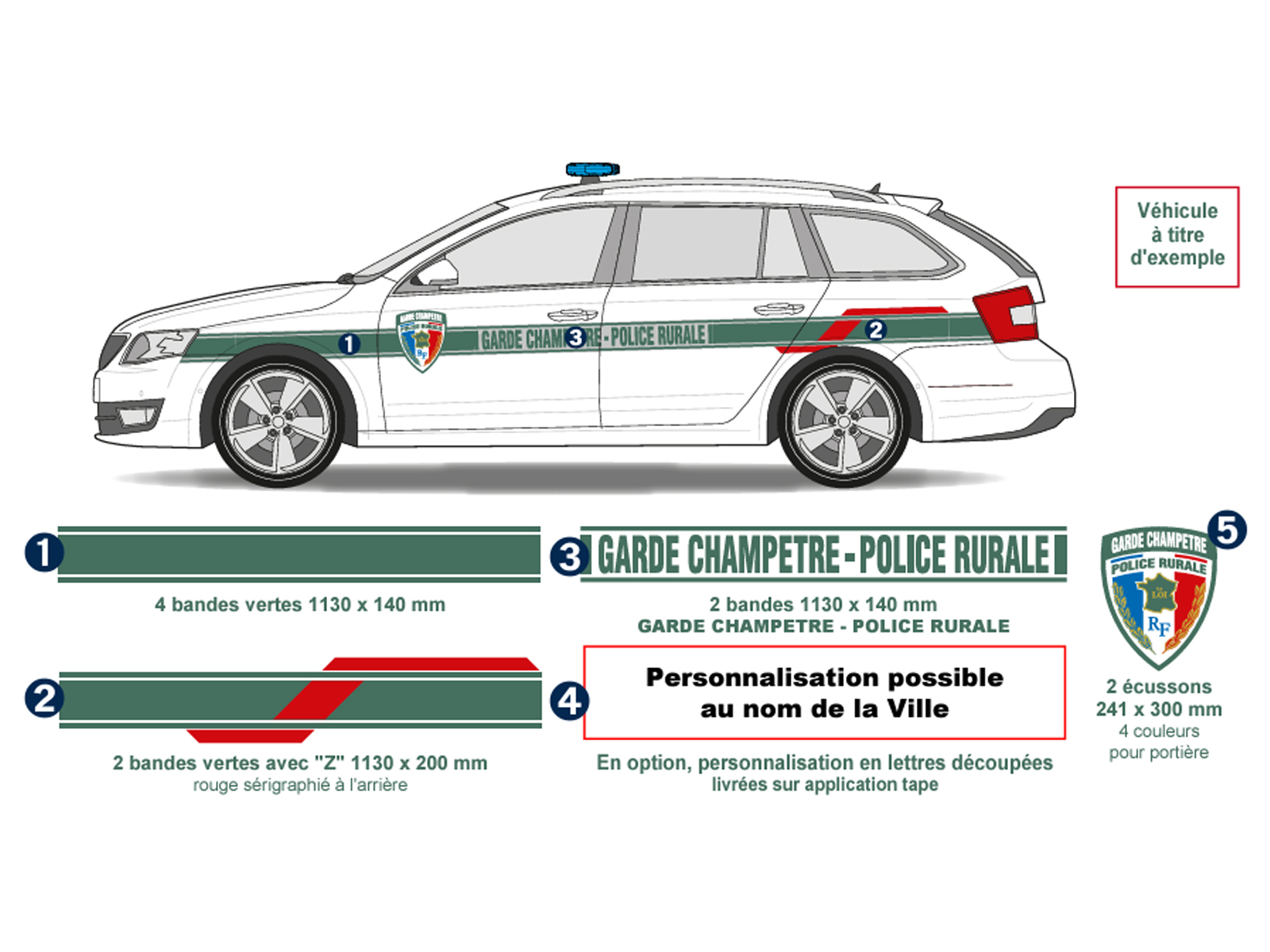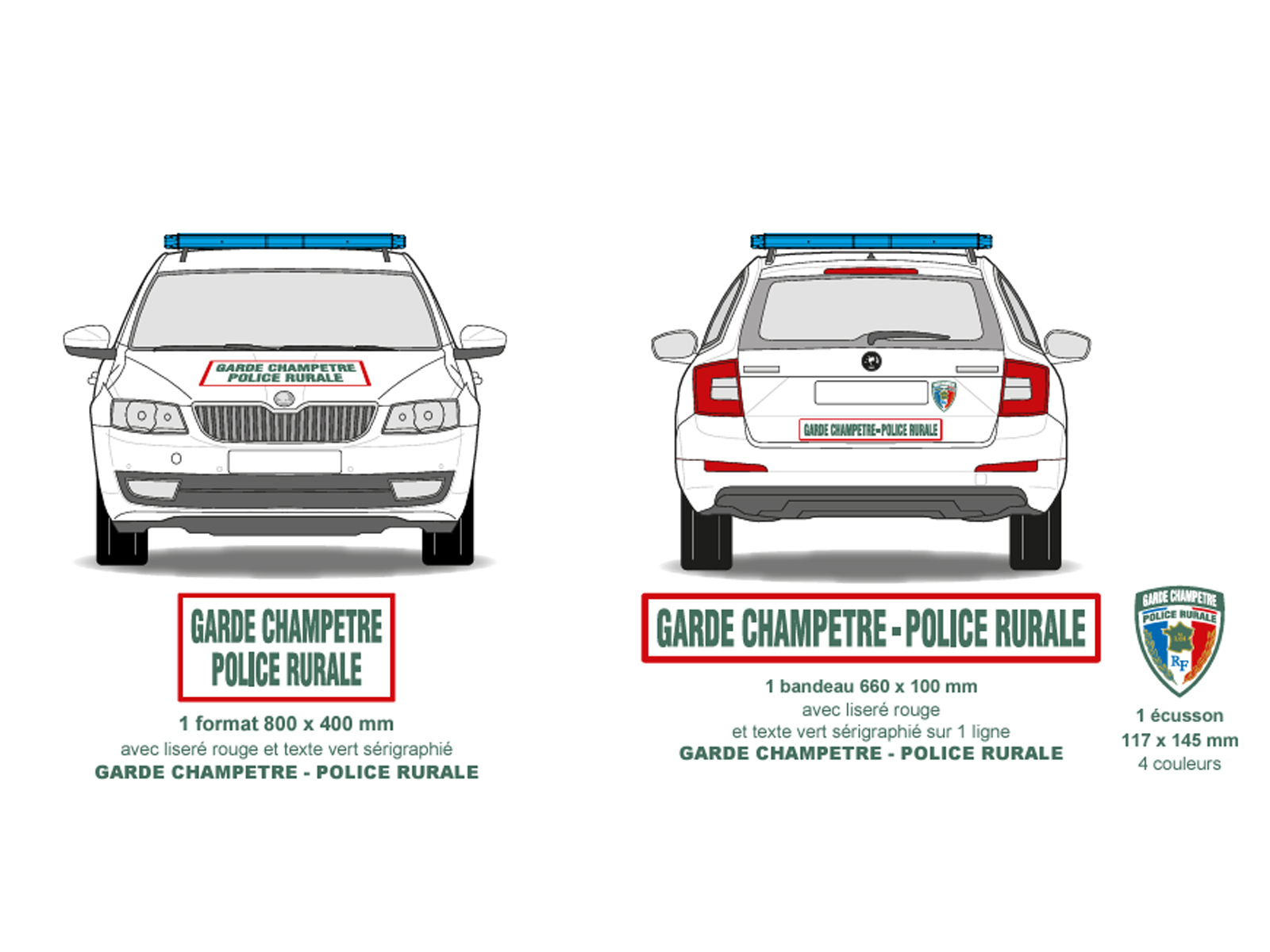 - 1 bandeau 660 x 100 mm avec liseré rouge et texte vert sérigraphié sur 1 ligne GARDE CHAMPETRE – POLICE RURALE