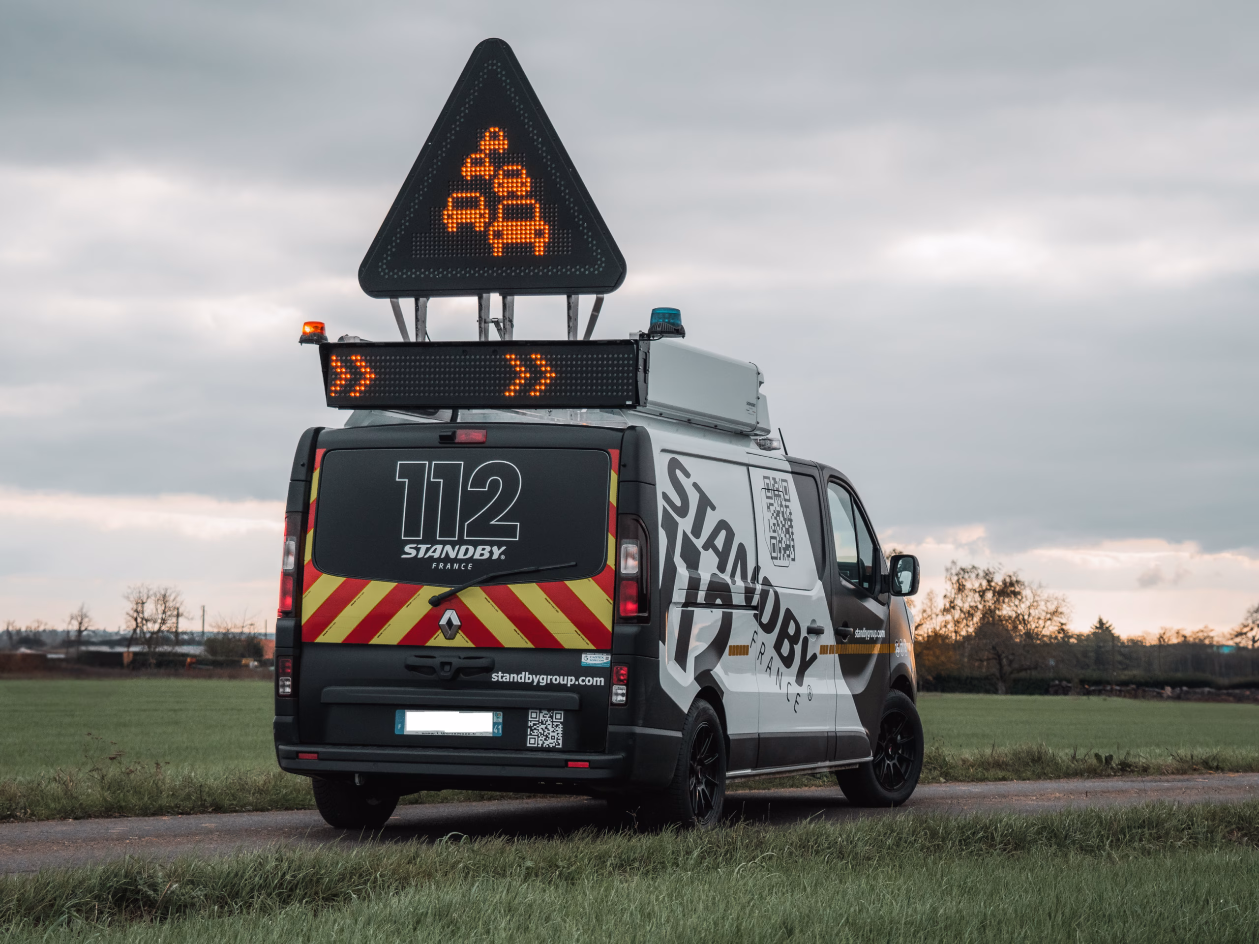 Le triangle est rabattable électriquement et orienté vers l’arrière du véhicule. Il respecte les normes NF P 98-532-7, XP P98-532-9 et la réglementation européenne EN 12966-1. Sa structure IP65 – IK08 assure une résistance optimale, même en conditions extrêmes. La commande s’effectue via le boîtier de l’ensemble, ce qui simplifie l’utilisation.