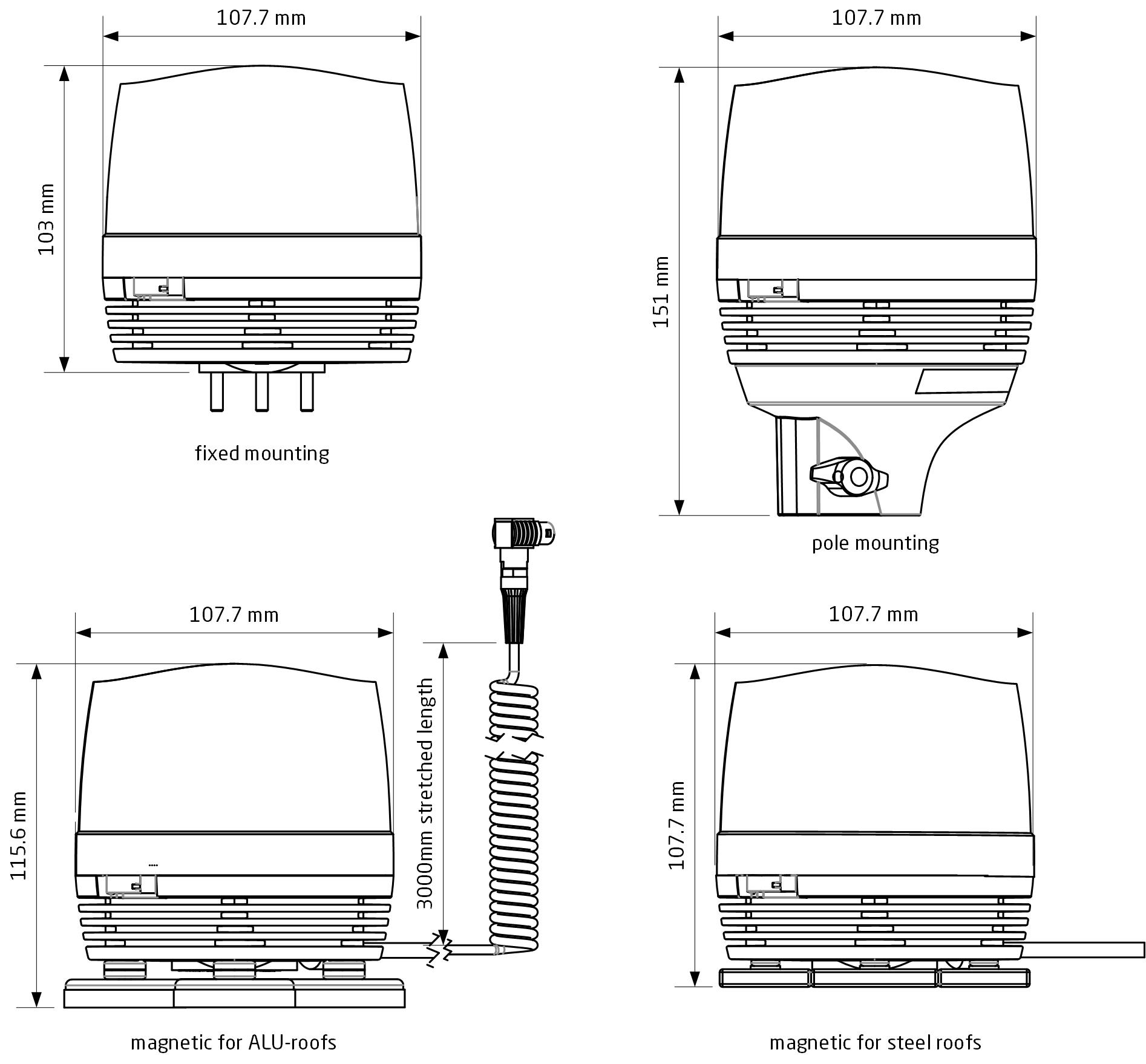 Två olika magnetfötter möjliggör användning på stål- eller aluminiumtak. Magnetversionen är testad upp till 320 km/h och godkänd enligt ECE R65 klass 2.