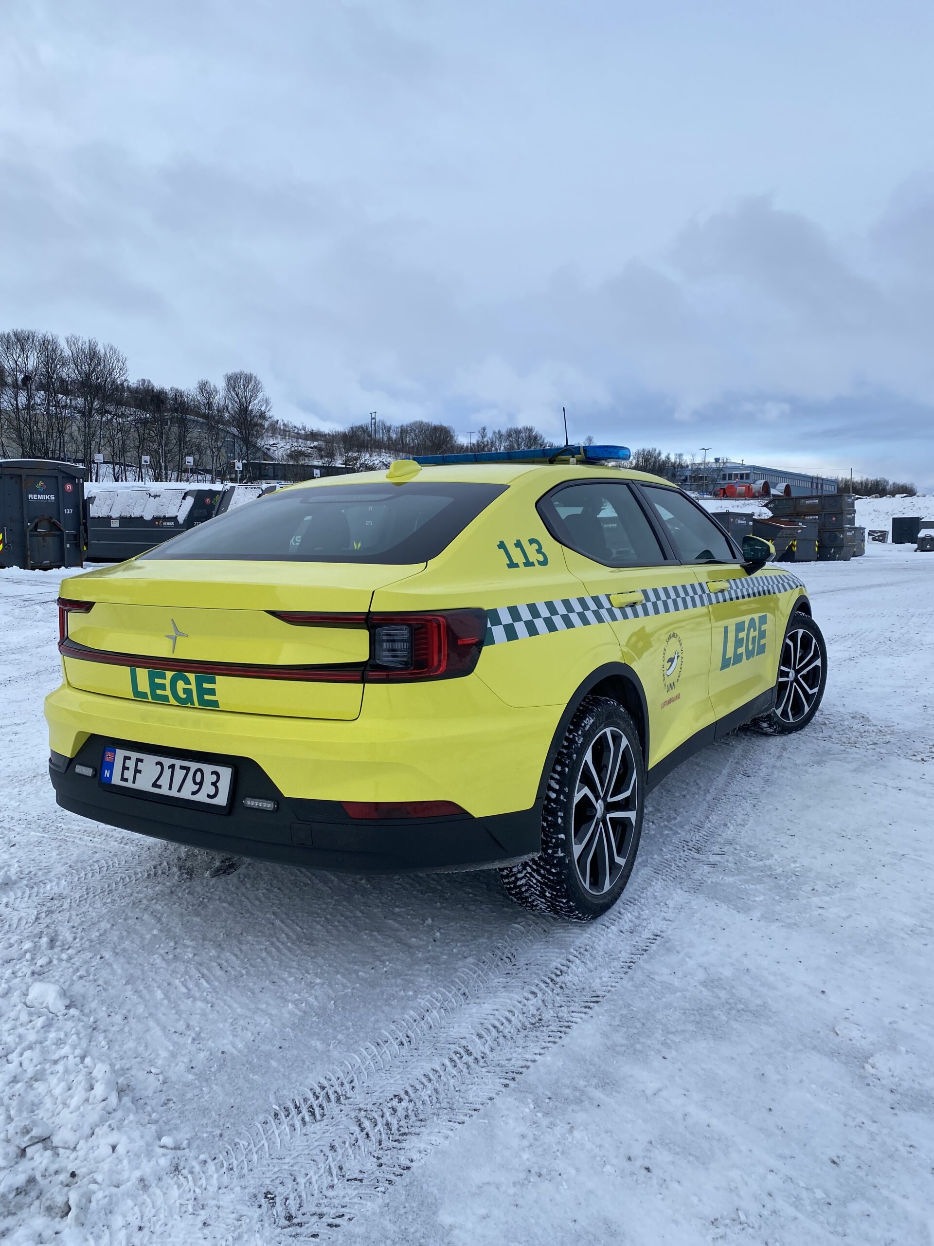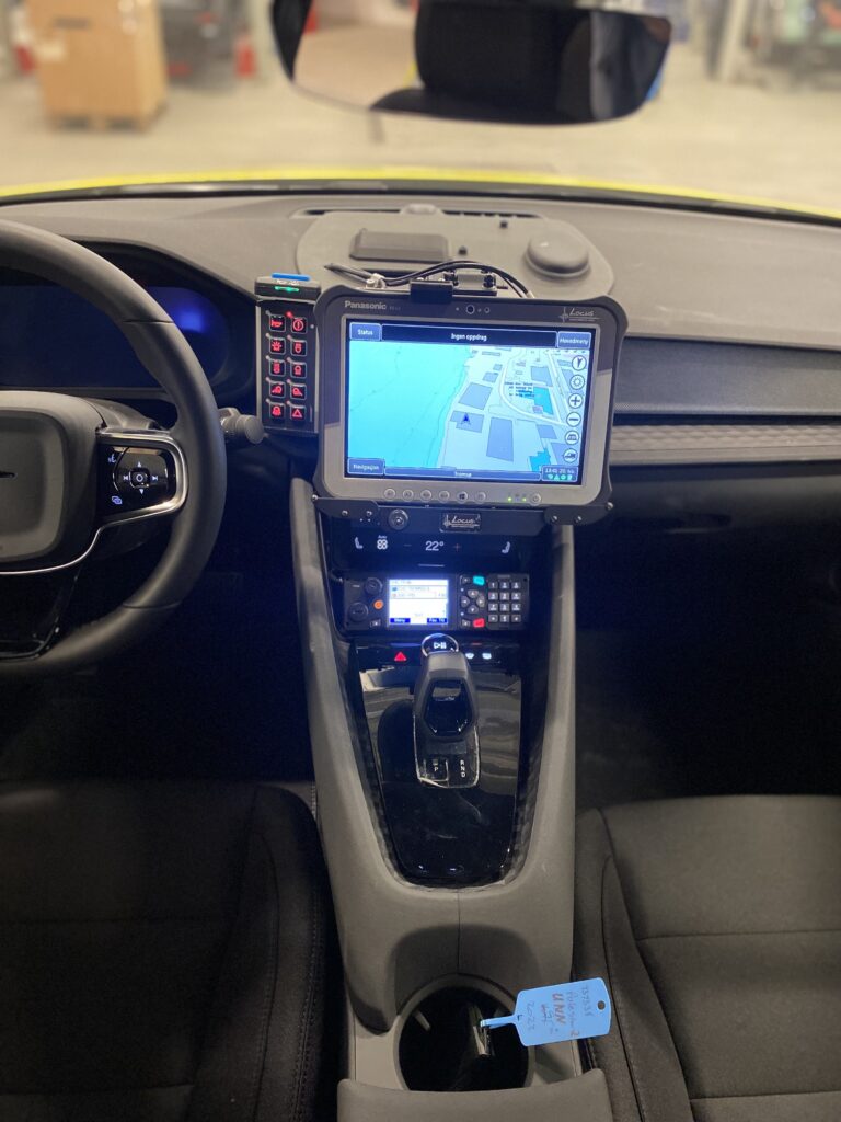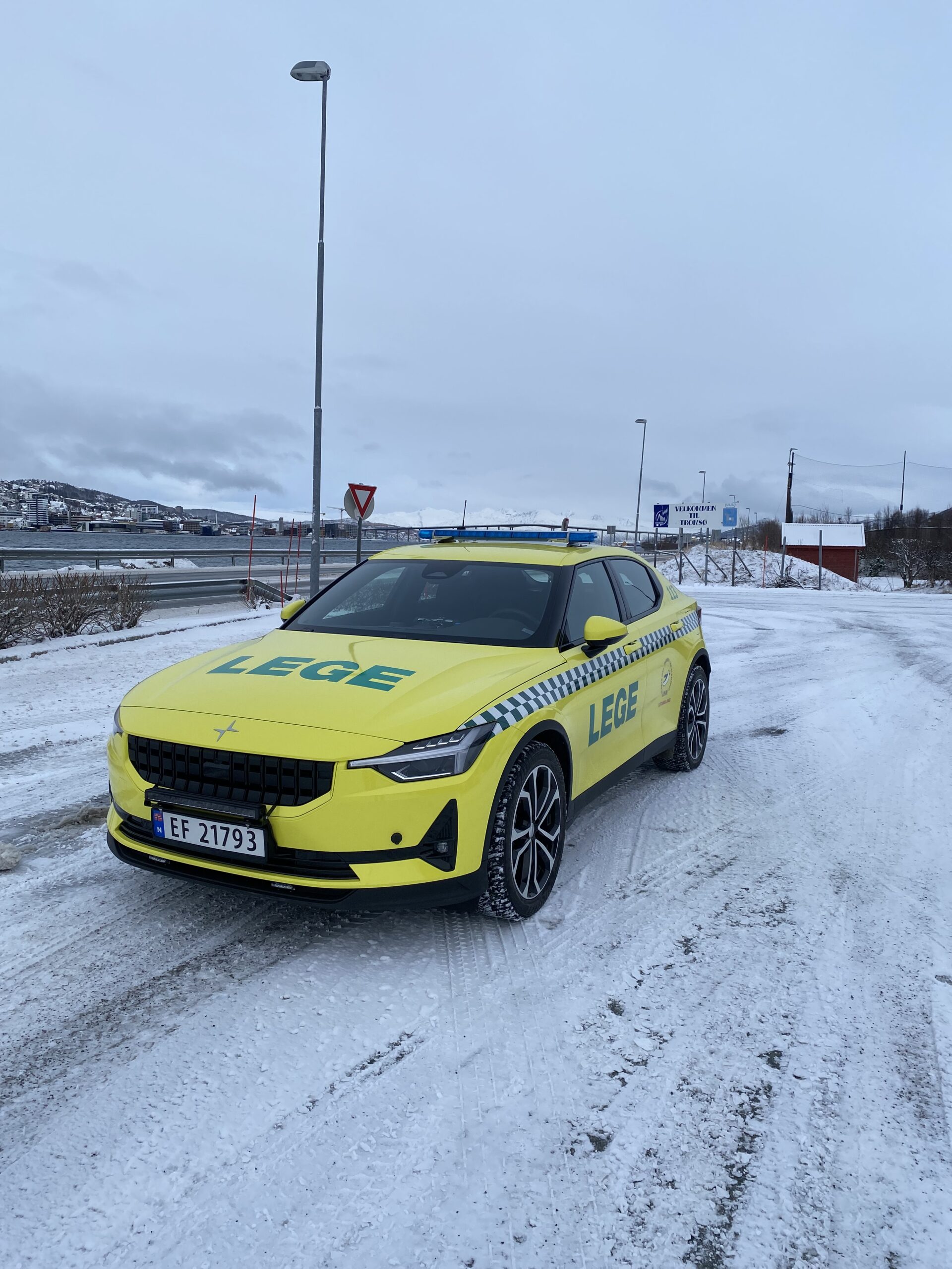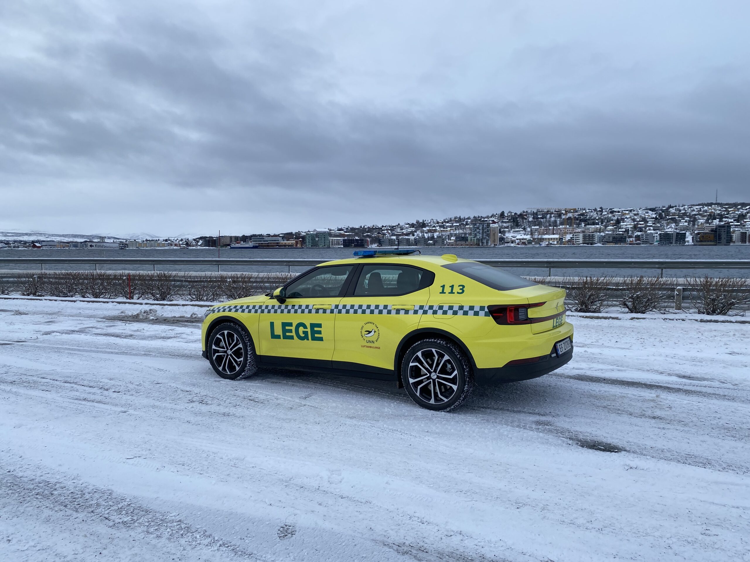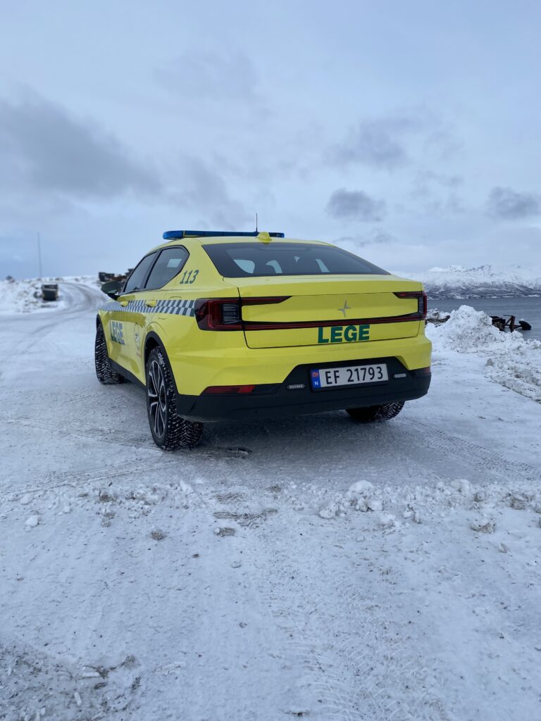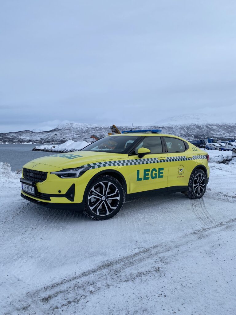Läkarbil byggd på Polestar 2 av Handicare Auto till Universitetssykehuset Nord-Norge. Standby-produkter på bilen är W3 Ljusramp, CS25 Styrsystem med P1 Panel samt L52 och L54 Varningsljus.