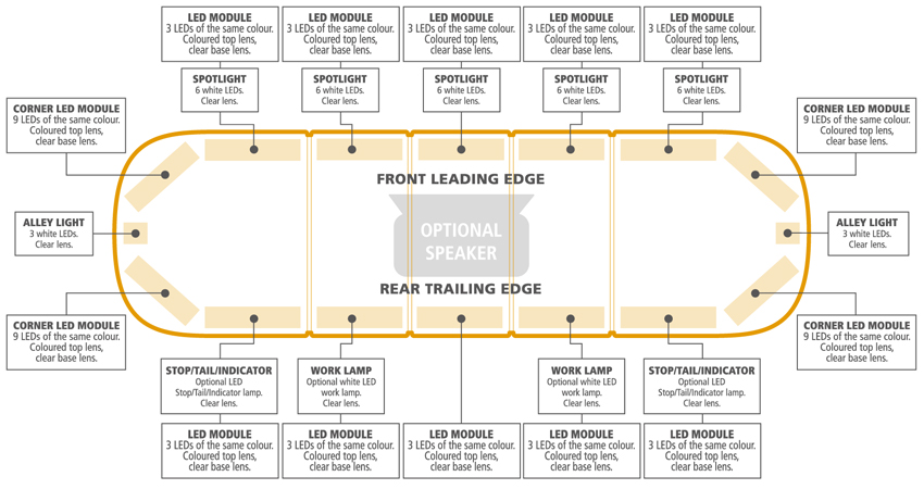 We have a standard range of amber Aegis lightbars however we are also able to engineer an Aegis lightbar to your personal requirements with a choice of coloured top lenses, amber, red or white LED modules, rear work lamps and stop/tail/indicator modules. In addition we are also able to incorporate an illuminated centre section or a 100w speaker, however these options are dependent upon stock levels at the time of ordering and may have a longer lead time than a standard lightbar.