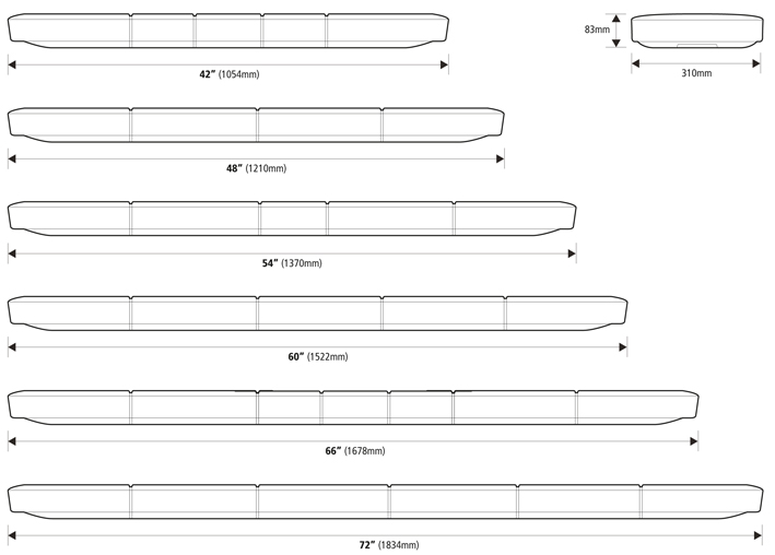 Available from 42” (1054mm) up to 54” (1370mm) long as standard with 7 selectable flash patterns and operates at 12v as standard with 24v available to order.