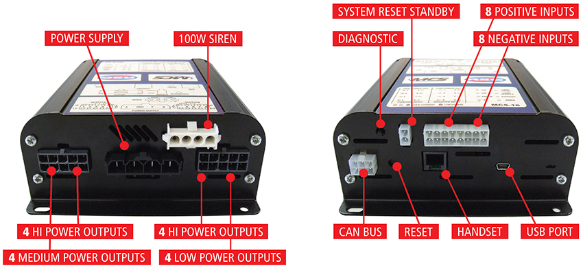 The MCS-16 Universal Controller consists of a main control box which contains everything required to control a vehicle mounted hazard warning system, typically comprising rooftop lighting, secondary hazard warning lights and audio equipment. It has 16 outputs and 16 configurable inputs with power management functions some of which may be implemented via the vehicle CAN Bus system. It also features a logic switch module to facilitate the control of auxiliary add-on devices such as: a Gateway Radio Controller, Audio Interface Controller and Fan Controller.