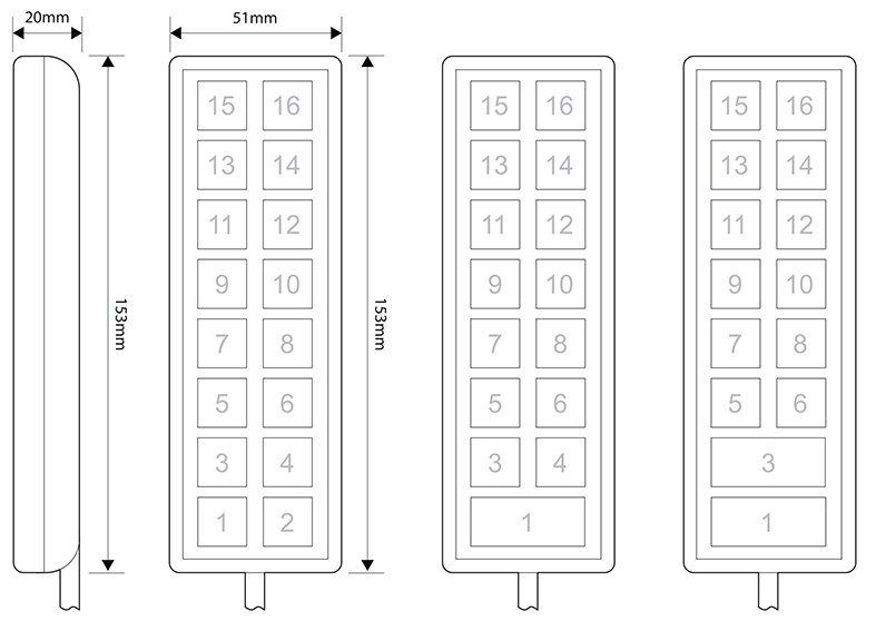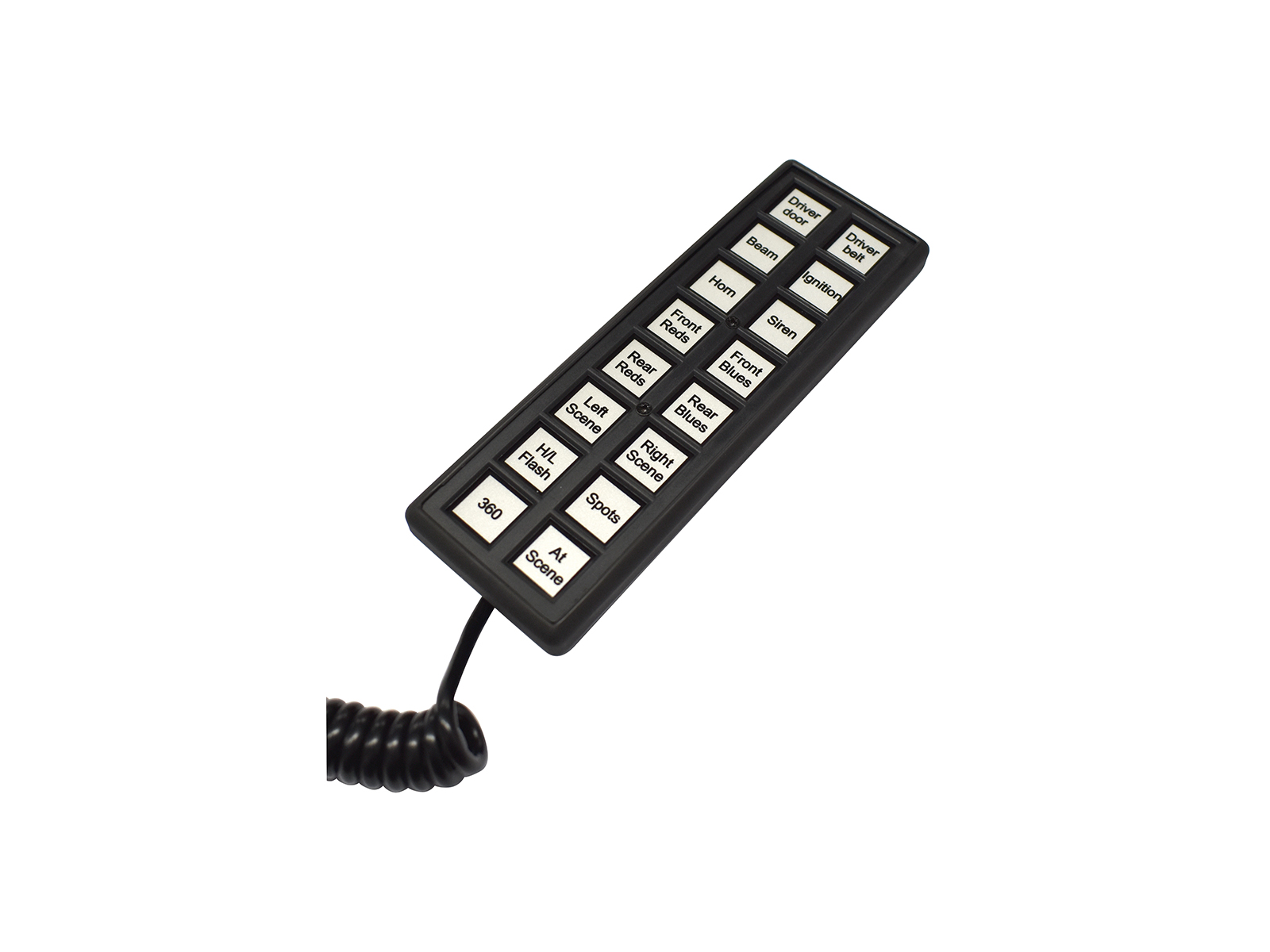The unit is available with 16 small buttons, 15 buttons (14 small and one double) or 14 buttons (12 small and 2 double) with the appropriate legend and key colour as standard, however, by combining 2 small buttons to make 1 large button the unit can have as few as 8 buttons if required. Additionally any button can be programmed for use as PTT (Push To Talk) when activating the built-in microphone.