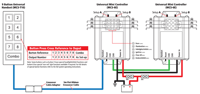 Combining two MCS-6E control units and the 9 button handset, the Midi Control System has all the features and functions of the MCS-MINI System, but due to the increased number of switches and associated outputs is ideally suited to applications needing more of both these operational facilities. Also, because there are actually more control lines (outputs) than switches this combination of devices is suited to applications where a single switch needs more than one output, for example flashing head lights, as one output is required per head lamp or alternatively alternating rear red lamps – note this feature is not available on the Mini or Maxi systems.