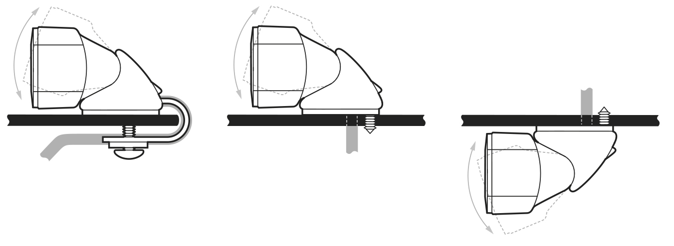 Hood mount Mini Stealths are available horizontal or vertical mount. They attach to the vehicle bonnet/bodywork via the unique wrap-around bracket. Discard the wrap-around bracket and the module can be surface mounted or suspended from the roof lining.